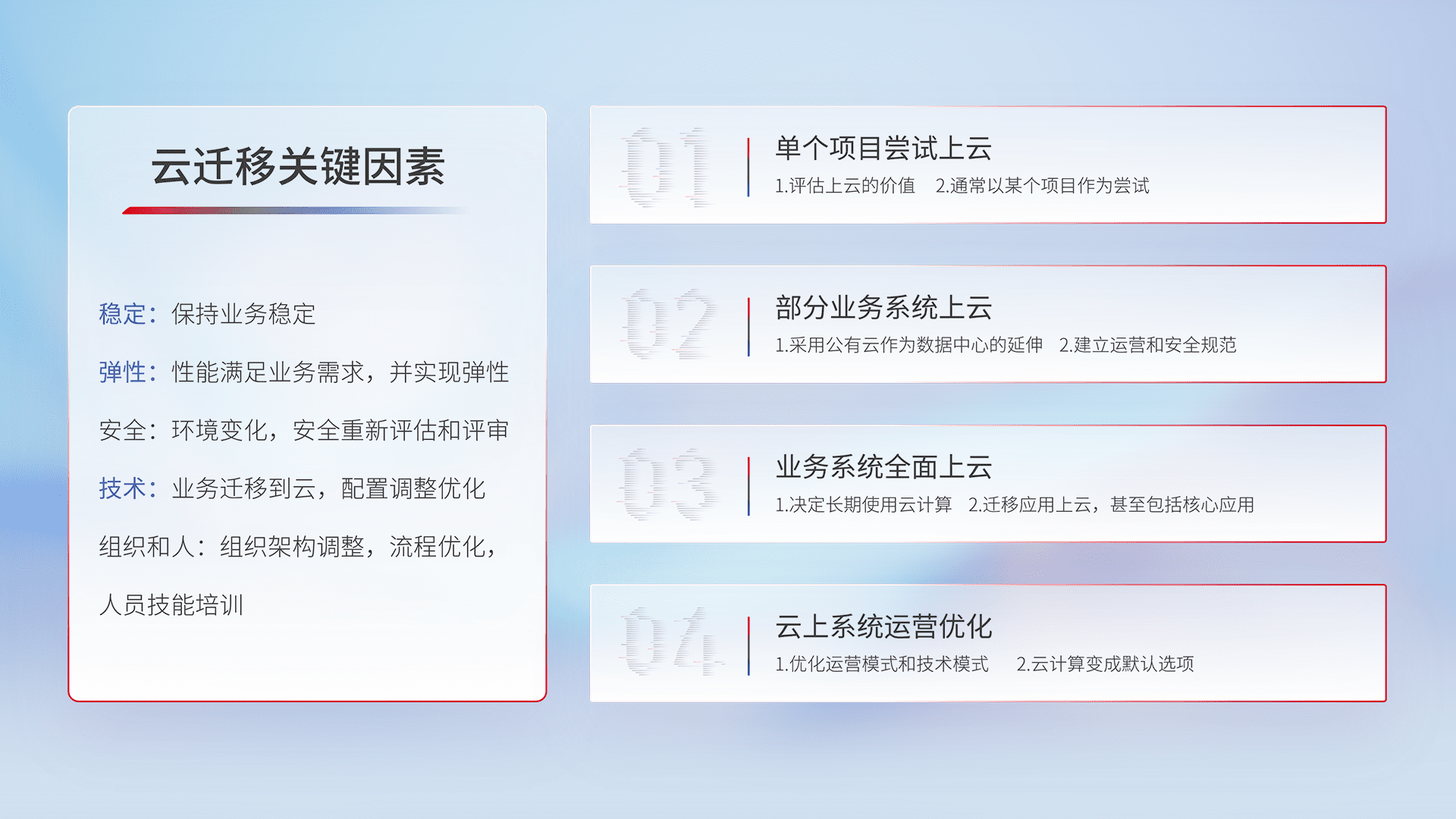 结合实际业务,,,,从规划设计、、云平台选型、、云原生改造、、、、数据迁移、、、集成交付,,,,迁移全过程为客户识别最佳上云路径,,,做好风险识别管理,,,设计网络架构、、、、身份权限、、、安全审计合规、、操作审计、、、、日志审计、、、监控告警策略、、多站点容灾设计等,,,,对云上基础设施进行整体规划,,,提升IT治理水平,,以满足弹性、、高可用、、高性能的需求。。