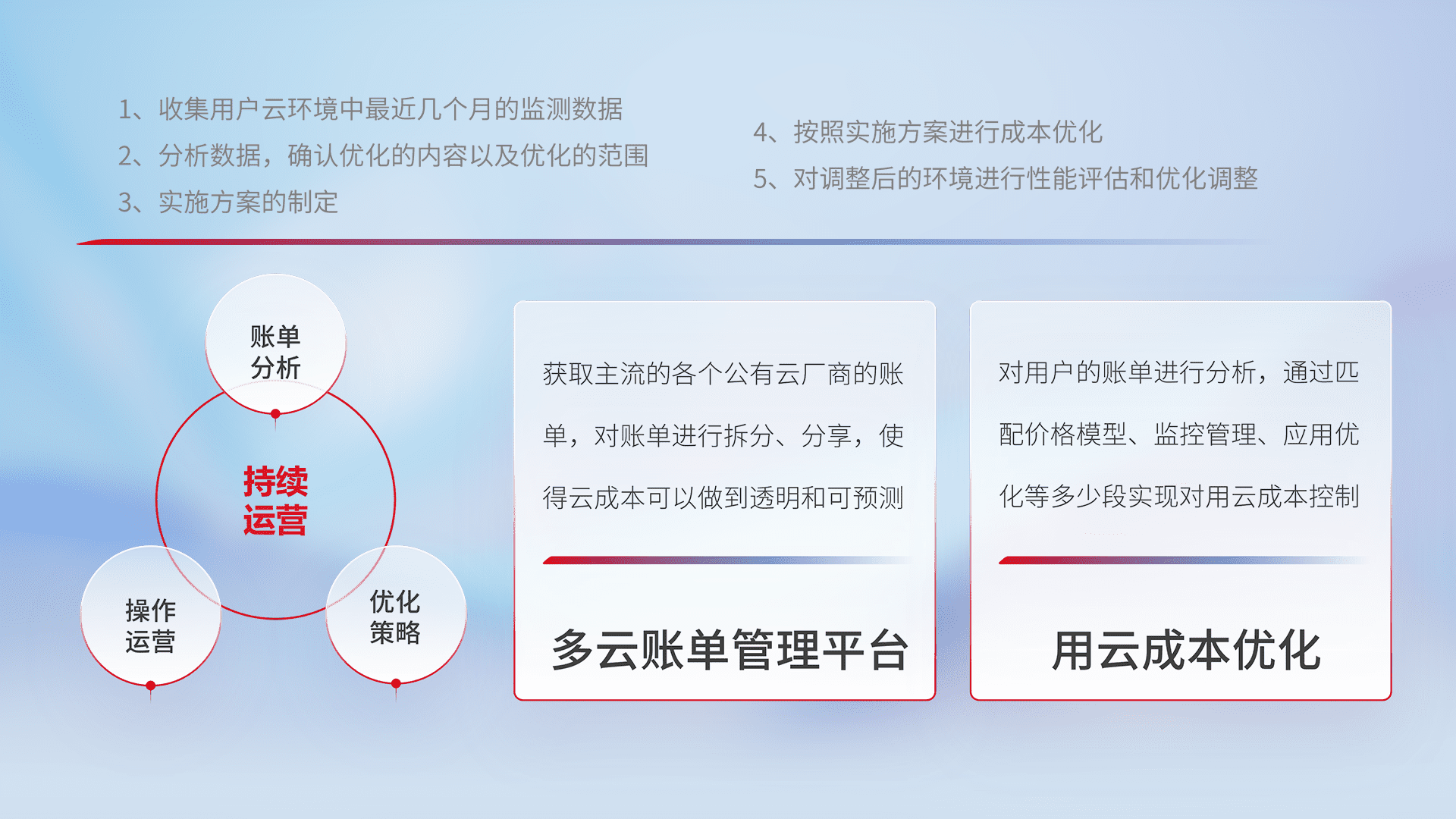 通过多云纳管,,以统一的资源数据模型把客户的云资源进行抽象和封装,,,,进而实现对多云资源的统一操作,,保障云资源管理的可靠性、、、稳定性与可用性。。。量身定制化运维内容,,,配置、、开发运维、、、补丁管理、、、、备份、、监控、、、认证和访问管理、、、审计和日常巡检等,,保障在用云过程中的可靠度,,稳定度以及高可用率。。